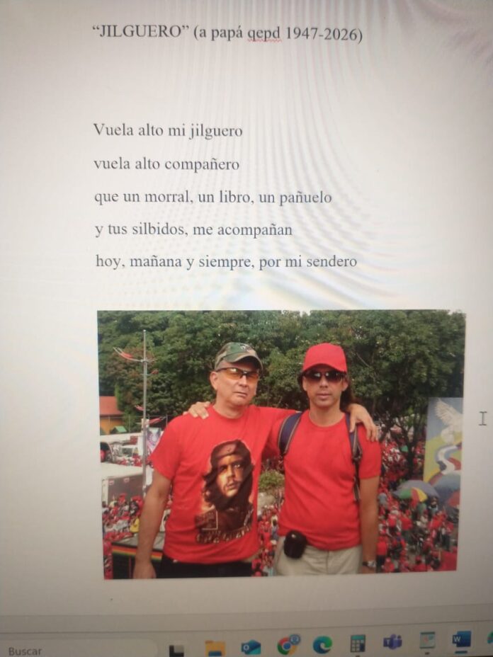 Cierro esta crónica diciendo: Mi alma va contigo mientras mi cuerpo te alcanza querido padre. Estoy agradecido con la vida por haberte tenido 52 años. Mi padre, compañero y amigo fallece el 15 de enero de 2026 con 78 años. Le dediqué este sencillo verso que titulé “Jilguero” por siempre estar silbando por la calle alguna melodía (aparte del gusto por la cantada). También solía siempre tener 2 bellos hábitos: la lectura y el de cargar con un pañuelo en su bolsillo.