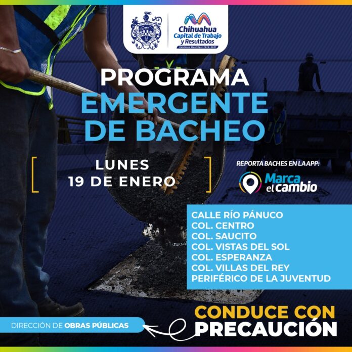 H. Ciudad de Chihuahua, Chih., a 19 de enero del 2026.- El Gobierno Municipal, a través de la Dirección de Obras Públicas, realizará trabajos de bacheo este lunes 19 de enero mediante el programa emergente en calles de las colonias: Centro, Saucito, Vistas del Sol, Esperanza, Villas del Rey, así como en la calle Río Pánuco y el periférico de la Juventud.