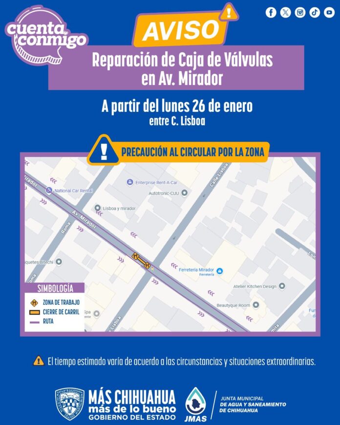 La Junta Municipal de Agua y Saneamiento (JMAS) de Chihuahua, informó que el próximo lunes 26 de enero llevará a cabo los trabajos de reparación de una caja de válvulas ubicada en la avenida Mirador y calle Lisboa, con el objetivo de mantener en óptimas condiciones la infraestructura hidráulica de la ciudad.