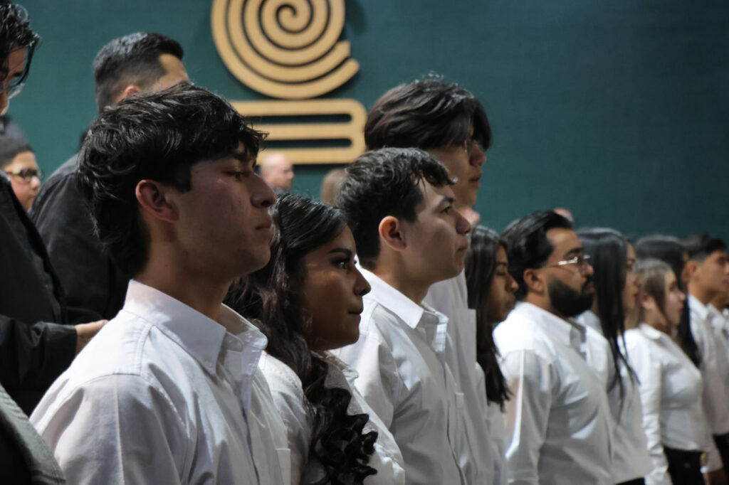 La ceremonia de graduación se realizó en el auditorio del Plantel 8 con la presencia de representantes de las instituciones aliadas, así como madres y padres de familia, quienes acompañaron a los graduandos en este logro académico.