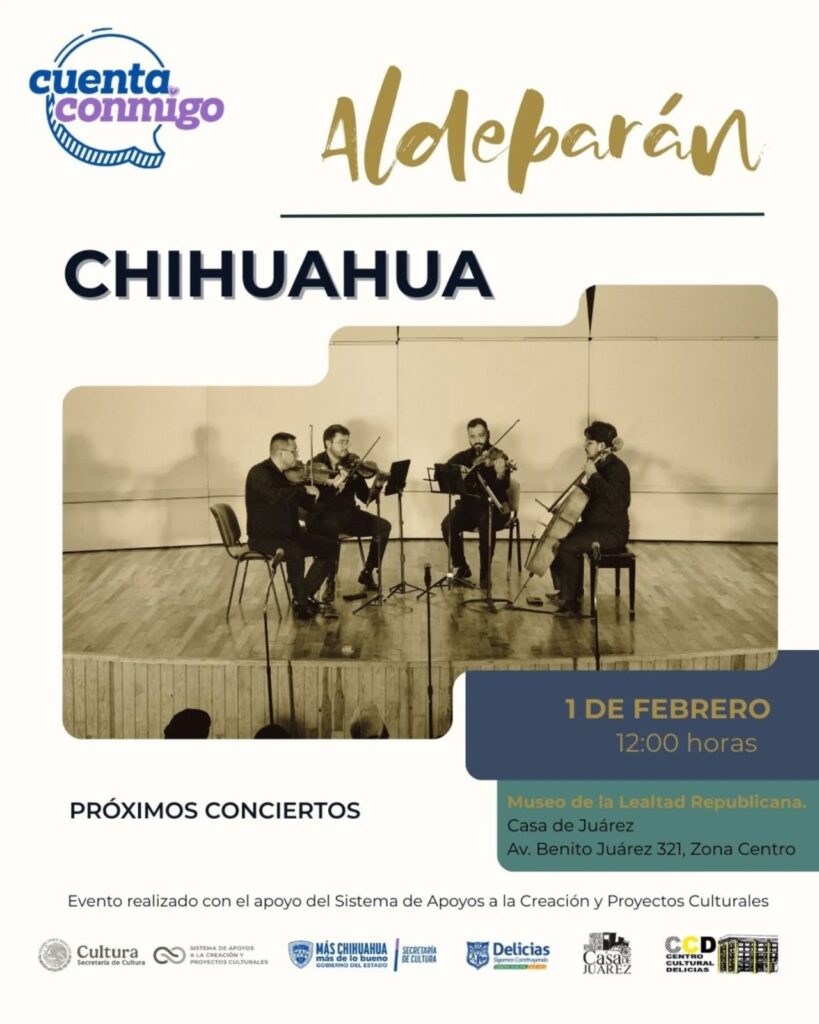 La Secretaría de Cultura anunció la presentación del cuarteto zacatecano “Aldebarán”, que ofrecerá conciertos de música de cámara este fin de semana en los municipios de Delicias y Chihuahua, con el objetivo de acercar este género musical a públicos de todas las edades.