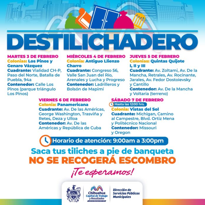 El Destilichadero consiste en retirar basura de grandes dimensiones que el camión recolector no puede trasladar, por lo que se pone a disposición de la población un contenedor en un punto fijo en un horario de 9:00 am a 3:00 pm de lunes a viernes y el sábado de 9:00 am al medio día.