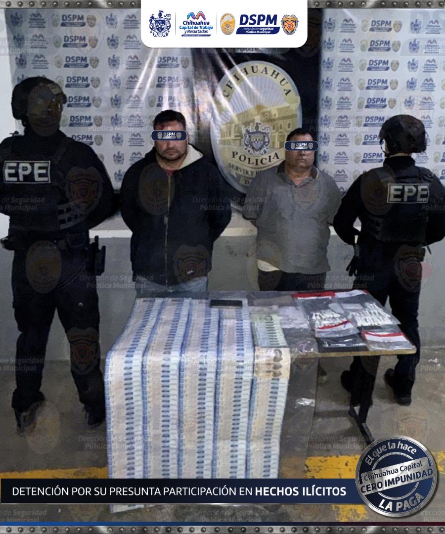 H. Ciudad de Chihuahua,. 1 de febrero de 2026.- En la colonia Rosario, policías municipales detuvieron a dos hombres por la supuesta posesión de 51 porciones de un polvo blanco de apariencia similar a la cocaína, contenidas en pequeñas bolsas de hule, así como más de 100 mil pesos en efectivo que fueron asegurados en el momento.