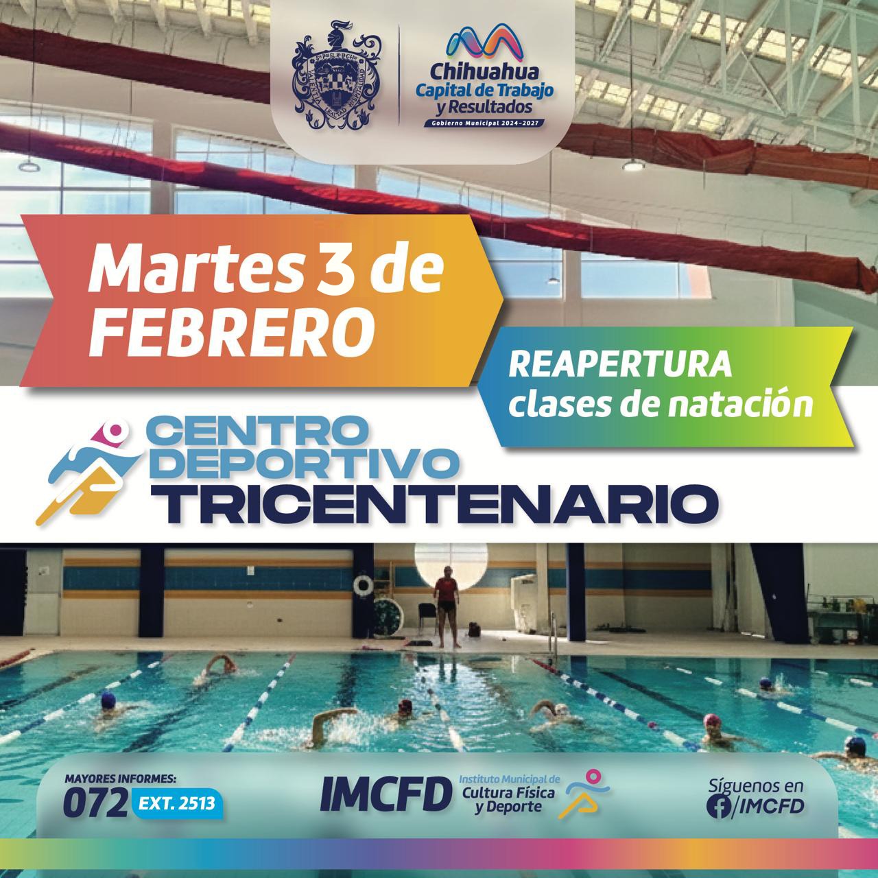 H. Ciudad de Chihuahua, Chih., a 1 de febrero de 2026.- El Gobierno Municipal, a través el Instituto Municipal de Cultura Física y Deporte (IMCFD), rehabilitó la alberca del Centro Deportivo Tricentenario y este martes 2 de febrero más de 500 usuarios retomarán sus clases y podrán disfrutar nuevamente de esta instalación municipal.