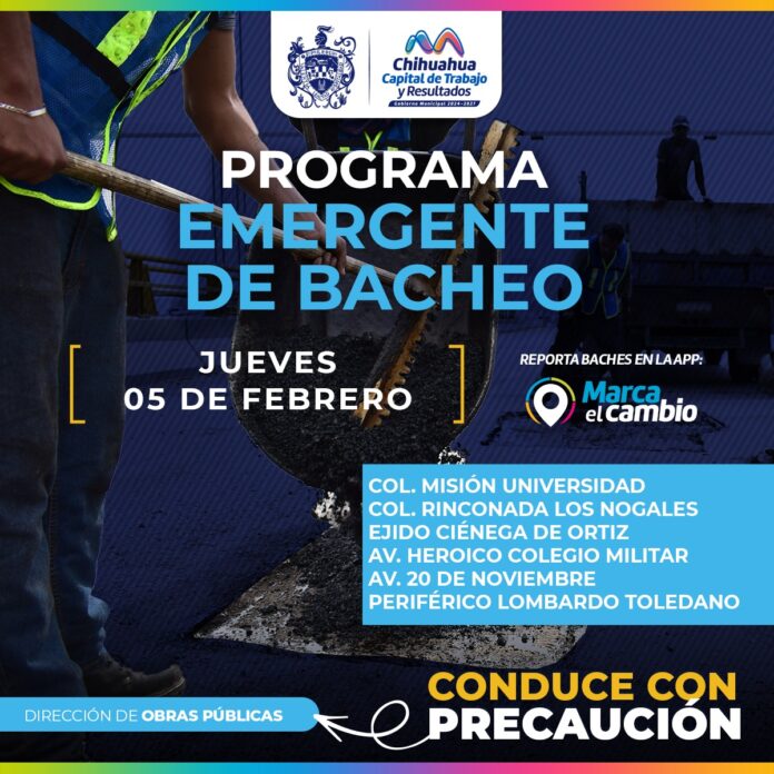H. Ciudad de Chihuahua, Chih., a 5 de febrero de 2026.- El Gobierno Municipal, a través de la Dirección de Obras Públicas, realizará trabajos de bacheo este jueves 5 de febrero mediante el programa emergente en calles de las colonias: Misión Universidad y Rinconada los Nogales, así como en las avenidas Heroico Colegio Militar y 20 de Noviembre, periférico Lombardo Toledano y en el Ejido Ciénega de Ortiz.