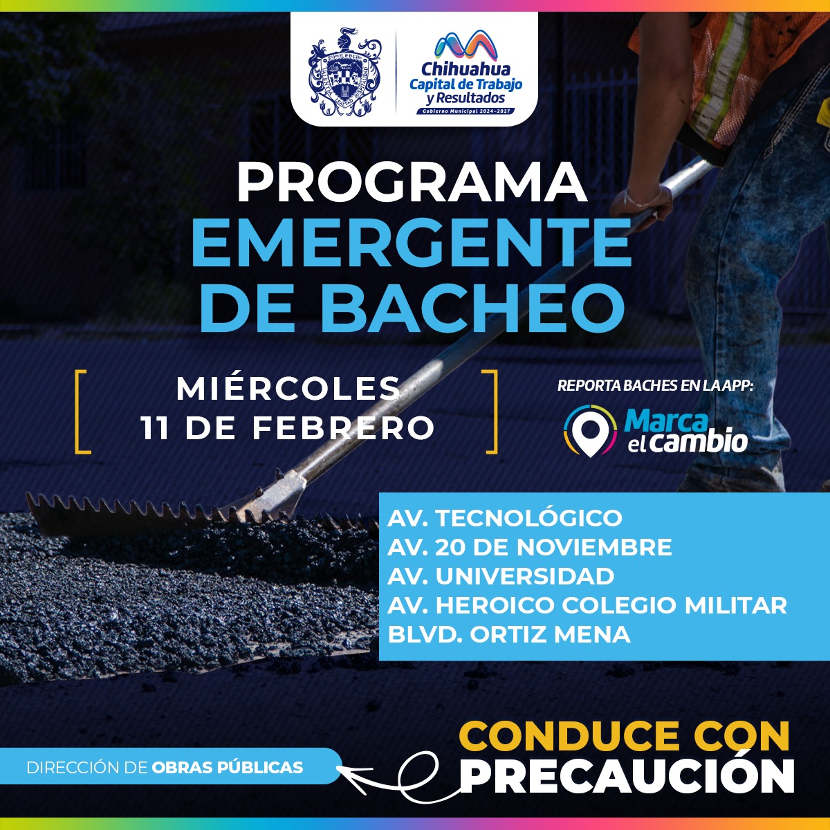 H. Ciudad de Chihuahua, Chih., a 11 de febrero de 2026.- El Gobierno Municipal, a través de la Dirección de Obras Públicas, realizará trabajos de bacheo este miércoles 11 de febrero mediante el programa emergente en las avenidas: Tecnológico, 20 de Noviembre, Universidad y Heroico Colegio Militar, así como en el boulevard Ortiz Mena.