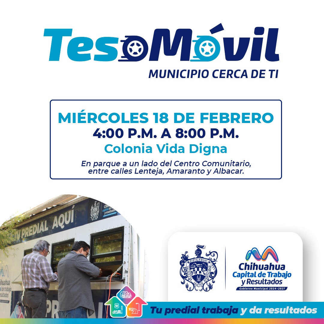 H. Ciudad de Chihuahua, Chih., a 16 de febrero de 2026.- El Gobierno Municipal, a través de la Tesorería, informa a la ciudadanía que el Teso Móvil acudirá este próximo miércoles 18 de febrero a la colonia Vida Digna, con el fin que los capitalinos que deseen pagar su Predial aprovechen el descuento del 8 por ciento que se tiene en este mes, o bien, si quieren regularizar que puedan realizar algún convenio de pago.