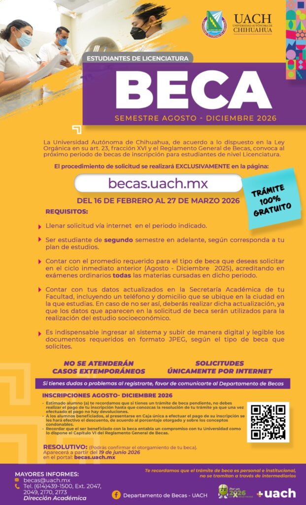 Es importante destacar que no se atenderán casos extemporáneos y que todas las solicitudes deberán realizarse únicamente a través de internet. La resolución de las solicitudes se publicará el 19 de junio de 2026 en la página oficial de becas de la UACH.