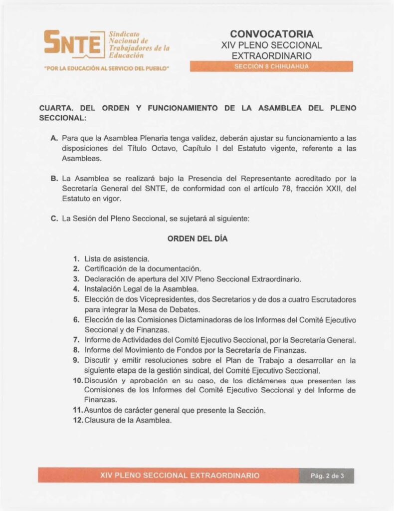 Hoy miércoles el Comité Ejecutivo Nacional del SNTE emitió formalmente la convocatoria al XIV Pleno Seccional Extraordinario de la Sección 8 del SNTE de Chihuahua, sesión que, por su naturaleza y alcances estatutarios, abre la puerta a la posterior emisión de la convocatoria para la renovación del Comité Ejecutivo Seccional.