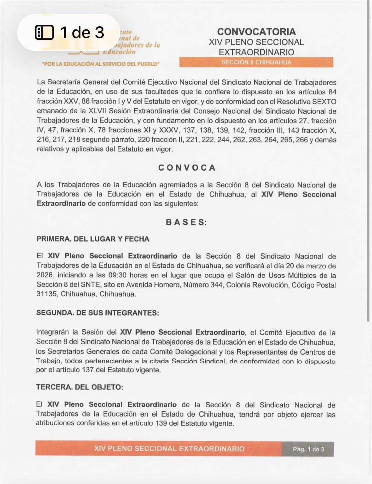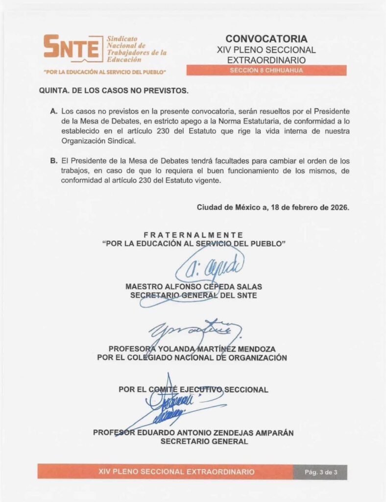El documento, signado en la Ciudad de México el 18 de febrero de 2026 por el secretario general del Sindicato Nacional de Trabajadores de la Educación, Alfonso Cepeda Salas, así como por la profesora Yolanda Martínez Mendoza y el secretario general de la Sección 8, Eduardo Antonio Zendejas Amparán, convoca a los trabajadores de la educación agremiados en Chihuahua a sesionar el próximo 20 de marzo de 2026 a las 9:30 horas en el Salón de Usos Múltiples de la organización, ubicado en la avenida Homero, en la capital del estado.