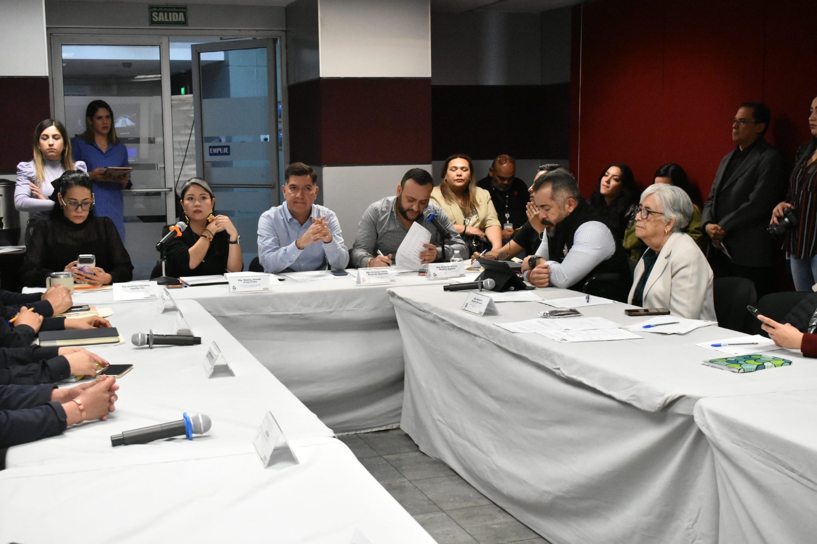 A la reunión de las comisiones unidas de Seguridad Pública y Protección Civil y Educación, Cultura Física y Deporte asistieron los diputados Arturo Medina (PRI), Octavio Borunda (PVEM), y las diputadas, América Aguilar, Elizabeth Guzman (MORENA), Herminia Gómez (MORENA), Xóchitl Contreras (PAN), y Nancy Frías (PAN), además de integrantes del Grupo de Orientación Escolar Chihuahuense (GOECHI) y de la Agencia Estatal de Investigación de la Fiscalía General del Estado.