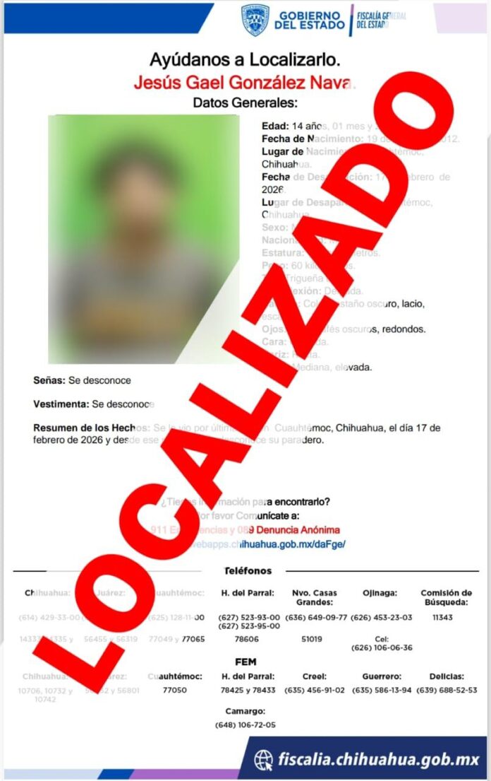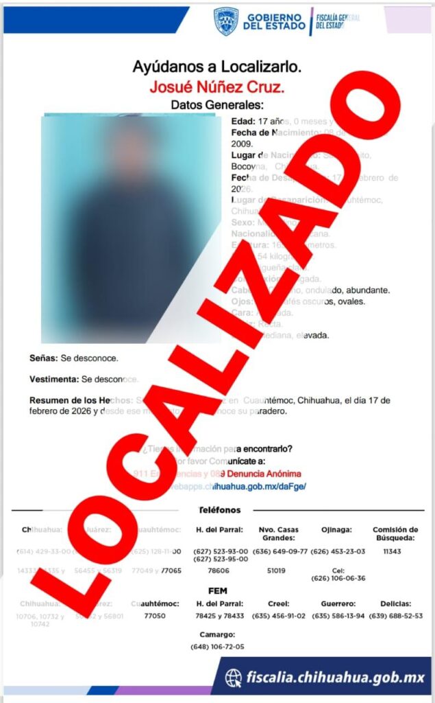 COMUNICADO DE PRENSA FGE/FDZO/2016Cuauhtémoc, Chih., a 19 de febrero del 2026 Localiza FGE a salvo a dos de tres menores reportados desaparecidos
