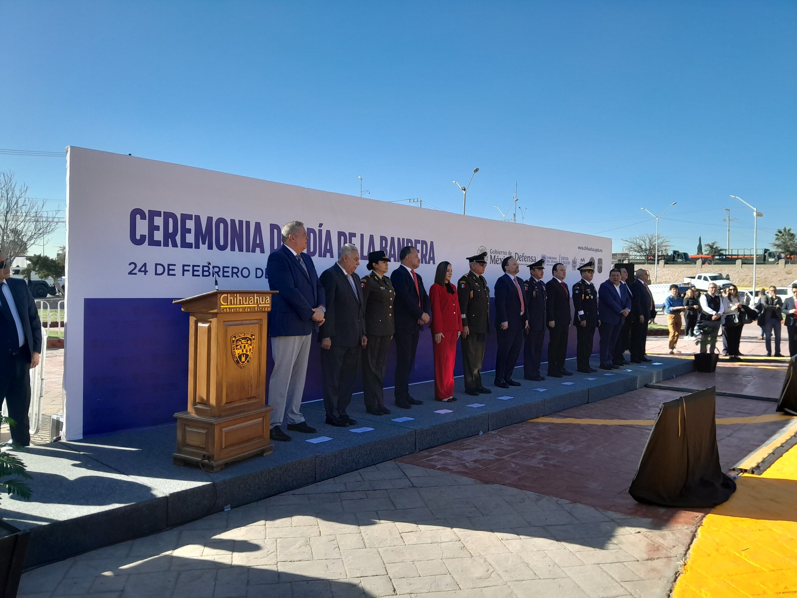 Autoridades del Gobierno del Estado de Chihuahua, en coordinación con la Secretaría de la Defensa Nacional, encabezaron este 24 de febrero la ceremonia cívica por el Día de la Bandera en la explanada del Parque El Palomar, donde se realizó el izamiento de la bandera monumental ante la presencia de autoridades civiles, militares y ciudadanía.
