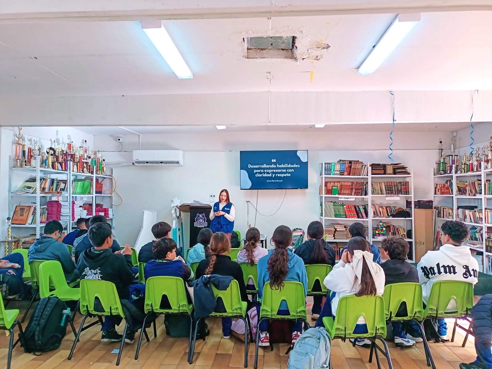 La Secretaría de Desarrollo Humano y Bien Común (SDHyBC), impartió la plática “Comunicación asertiva, relación entre compañeros y noviazgos en la adolescencia”, a estudiantes de la Escuela Secundaria Estatal 3010, en la ciudad de Chihuahua, con el objetivo de fortalecer las relaciones sanas en su entorno.