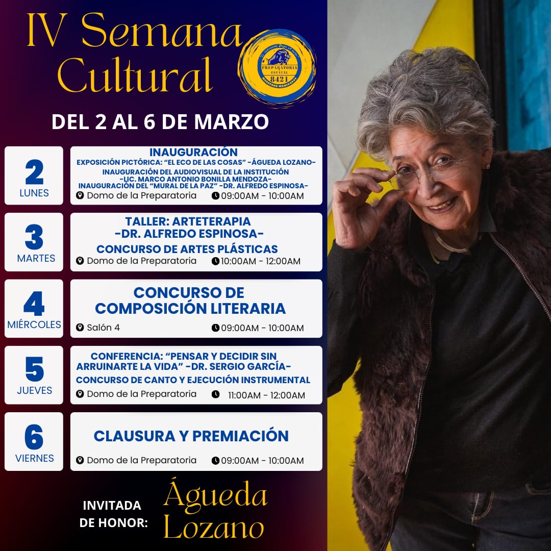 La Escuela Preparatoria Estatal Maestros Mexicanos 8421 celebrará del 2 al 6 de marzo de 2025 su 4ª Semana Cultural, un espacio que apuesta por fortalecer la formación integral del alumnado a través de actividades académicas, artísticas y humanísticas. El evento tendrá como invitada de honor a la reconocida artista plástica Águeda Lozano, cuya presencia engalanará la inauguración oficial.