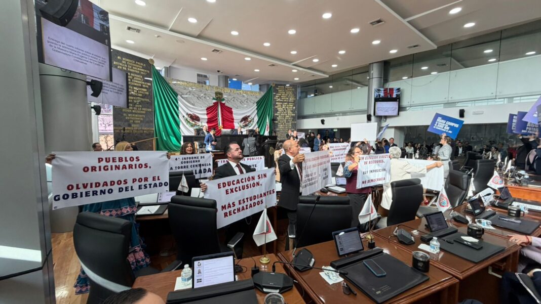 Chihuahua, Chih.- Diputados del grupo parlamentario de Morena protagonizaron una protesta dentro del Congreso del Estado durante la entrega de la glosa del cuarto informe de gobierno de la gobernadora María Eugenia Campos, exigiendo justicia y resultados concretos ante la persistencia de rezagos históricos en la entidad.