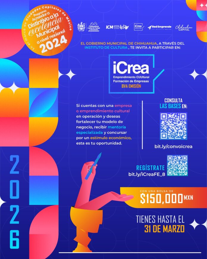 H. Ciudad de Chihuahua, Chih. a 2 de marzo de 2026.- El Gobierno Municipal, a través del Instituto de Cultura del Municipio, convoca a artistas, creadores y emprendedores culturales a participar en el programa: iCREA Emprendimiento Cuultural Formación de Empresas 8a Edición.