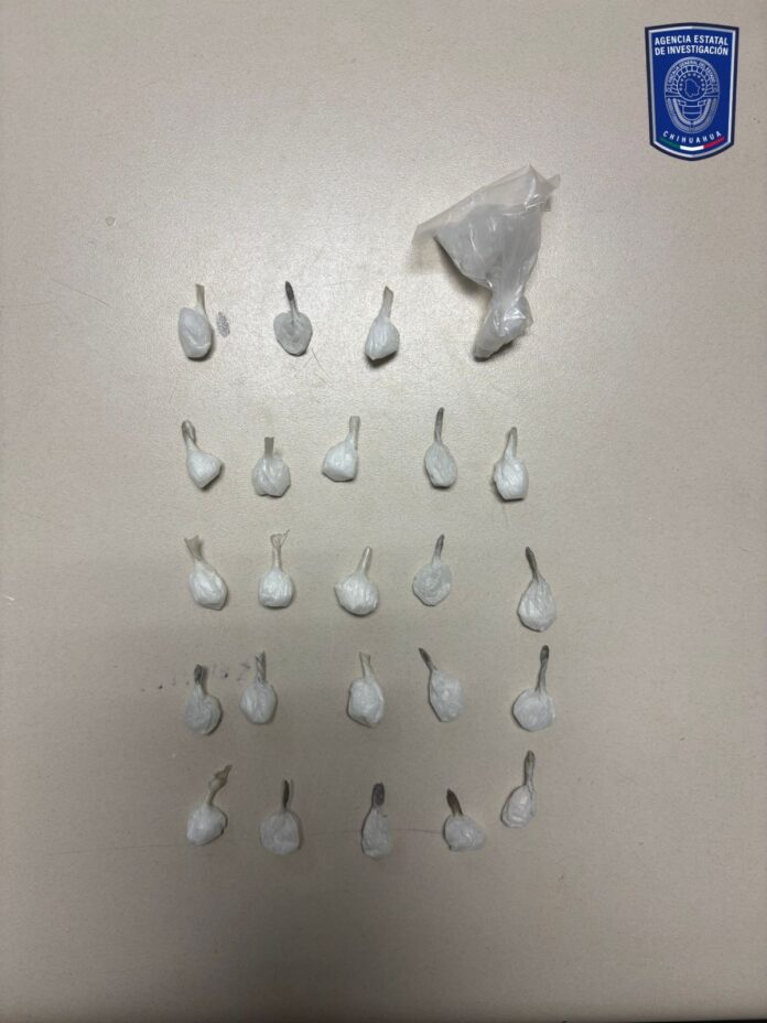 • 24 envoltorios de plástico transparente, que en su interior contenían una sustancia blanca, sólida y granulada, con las características propias de la metanfetamina comúnmente conocida como cristal, dando un peso total de 18 gramos.