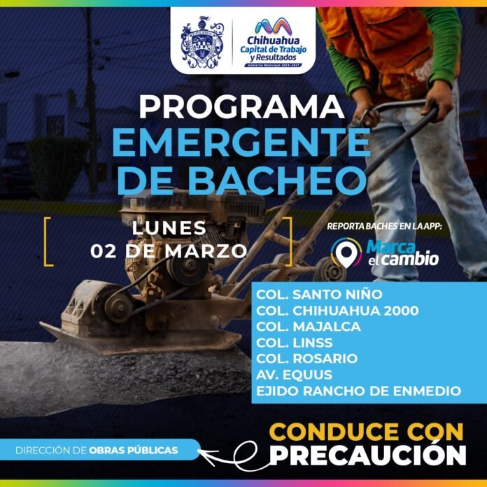 H. Ciudad de Chihuahua, Chih., a 2 de marzo de 2026.- El Gobierno Municipal, a través de la Dirección de Obras Públicas, realizará trabajos de bacheo este lunes 02 de marzo mediante el programa emergente en las calles de las colonias: Santo Niño, Chihuahua 2000, Majalca, Linss y Rosario, así como en la avenida Equus y el Ejido Rancho de Enmedio.