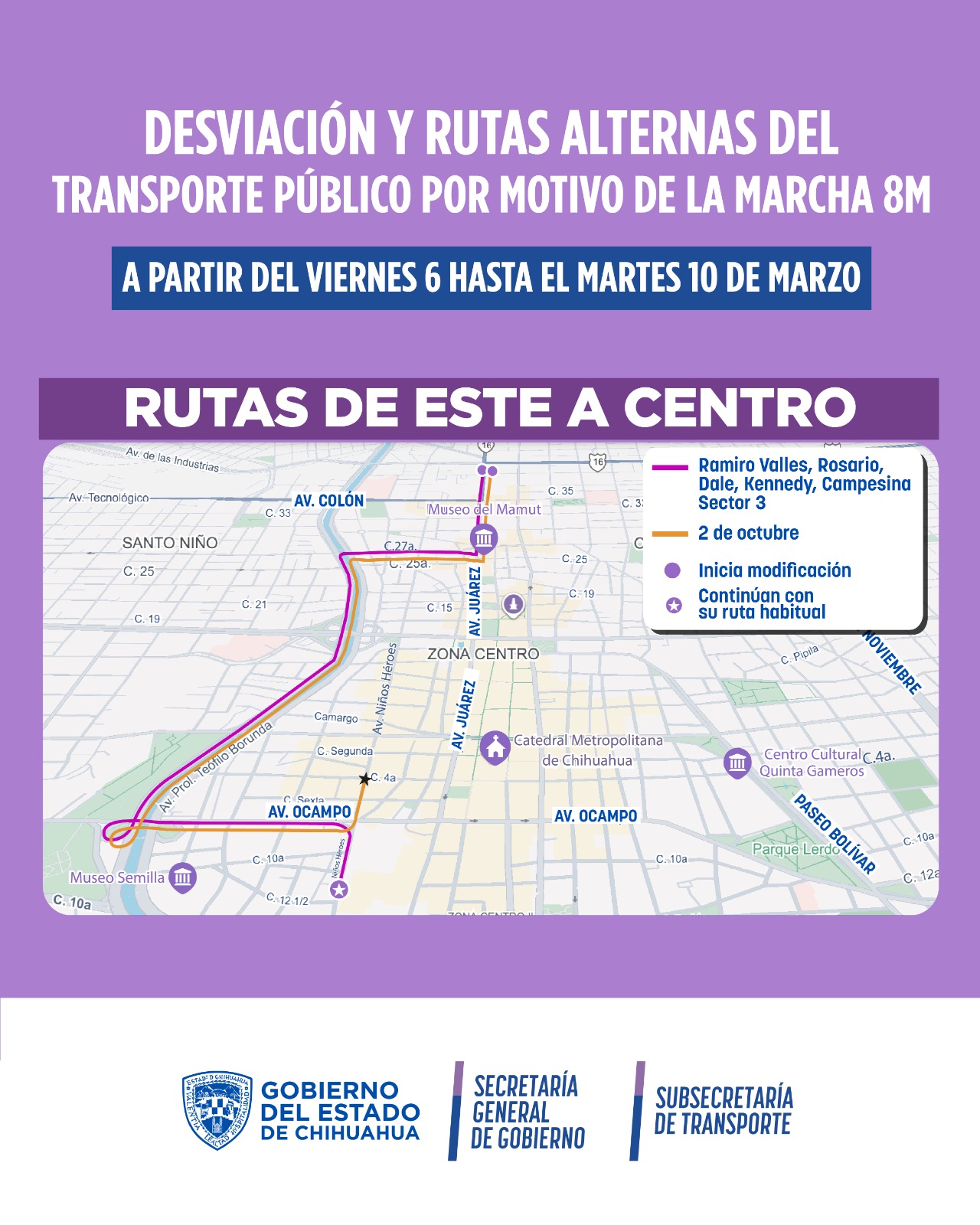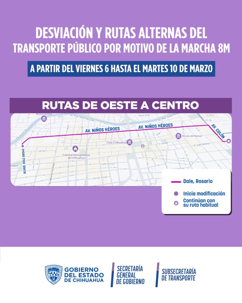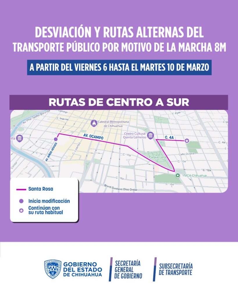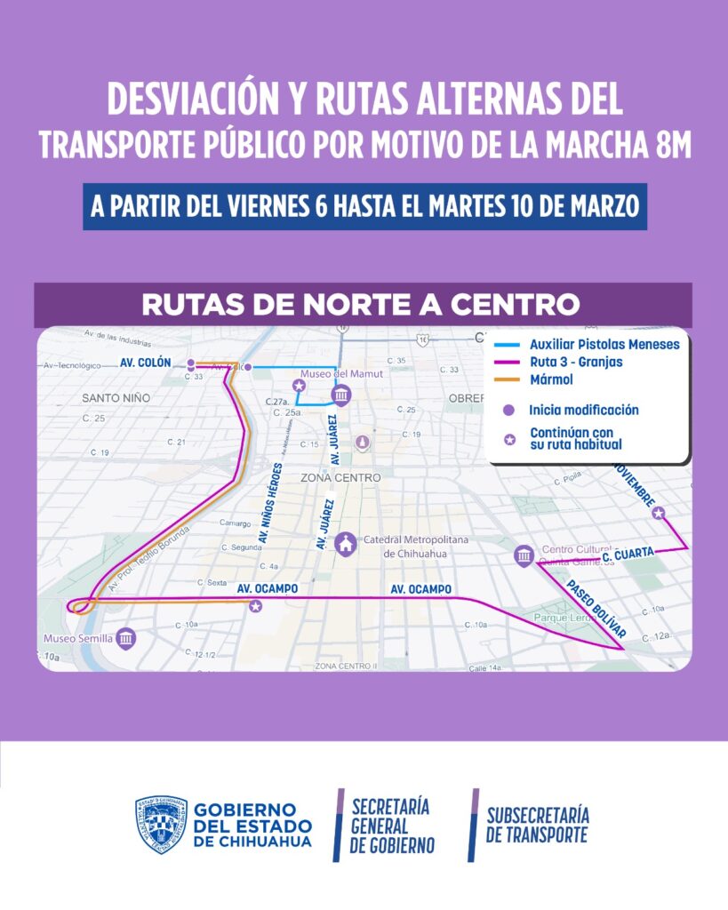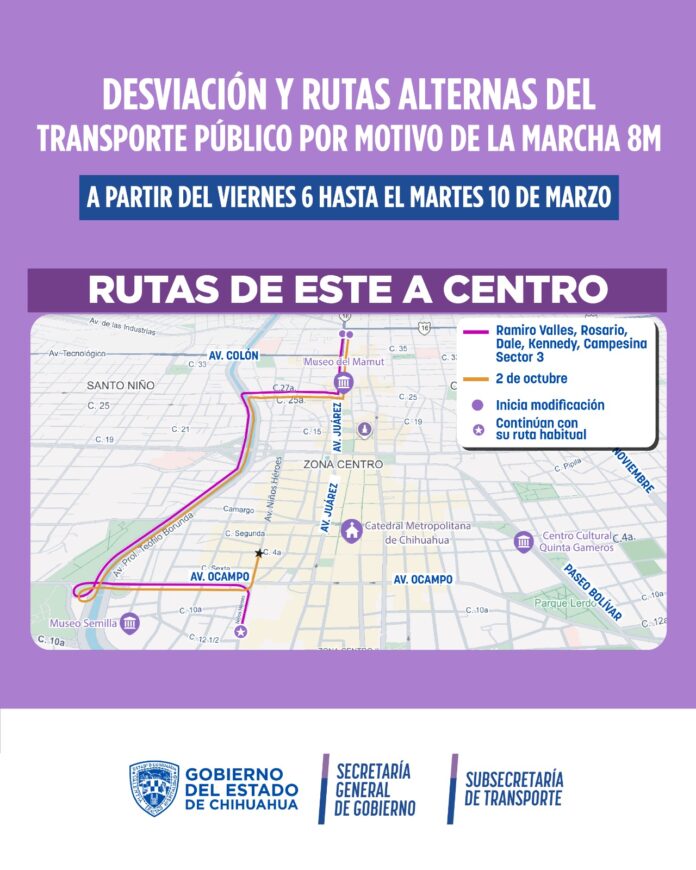 La Secretaría General de Gobierno, a través de la Subsecretaría de Transporte informó los cambios temporales en distintas rutas por el centro de la capital, desde las 6:00 de la mañana del viernes 6 de marzo, hasta las 6:00 de la mañana del martes 10 de marzo, con motivo de la marcha del 8M.