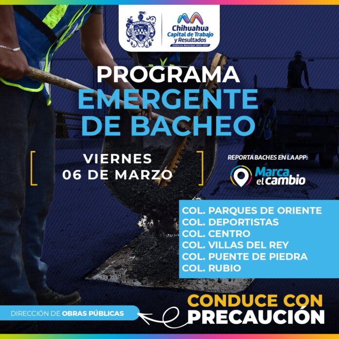 H. Ciudad de Chihuahua, Chih., a 6 de marzo de 2026.- El Gobierno Municipal, a través de la Dirección de Obras Públicas, realizará trabajos de bacheo este viernes 6 de marzo mediante el programa emergente en las calles de las colonias: Parques de Oriente, Deportistas, Centro, Villas del Rey, Puente de Piedra y Rubio.
