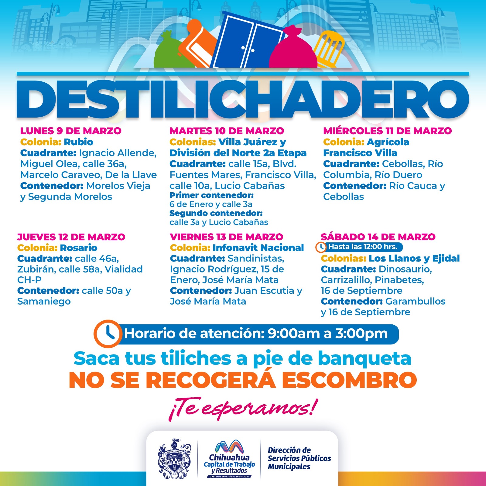 Para evitar acumulaciones de basura de grandes dimensiones en las viviendas, que podría generar plagas o problemas de salud, el Gobierno Municipal, a través de la Dirección de Servicios Públicos Municipales, informa el calendario del programa Destilichadero, que se realizará en ocho colonias de la capital del 9 al 14 de marzo.