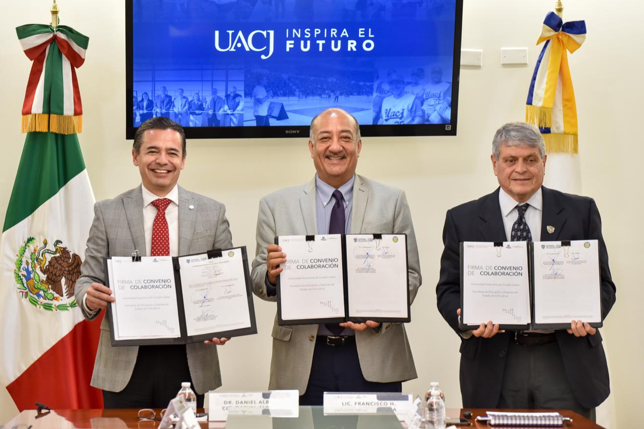 La firma de ambos convenios de colaboración estuvo a cargo del secretario de Educación y Deporte, Francisco Hugo Gutiérrez Dávila; y el rector de la UACJ, Daniel Alberto Constandse Cortez.