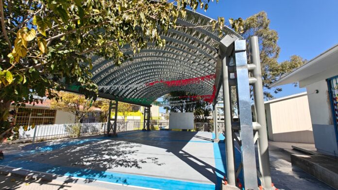 H. Ciudad de Chihuahua, Chih., a 9 de marzo de 2026.- Uno de los objetivos del alcalde Marco Bonilla es que las escuelas cuenten con infraestructura de calidad, por ello, el Gobierno Municipal construyó, gracias al Presupuesto Participativo, un domo metálico en el Jardín de Niños Teresa de Calcuta, en la colonia Juan Guereca, donde podrán realizar actividades escolares en mejores condiciones.