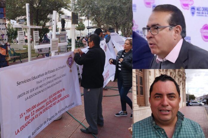 La mañana de este martes, un pequeño grupo de integrantes de la Asociación de Madres y Padres de Familia del Municipio de Chihuahua se manifestó frente a Palacio de Gobierno para denunciar lo que consideran un intento de cobrar el servicio de agua a las escuelas públicas, situación que —aseguraron— afectaría directamente a las asociaciones de padres.