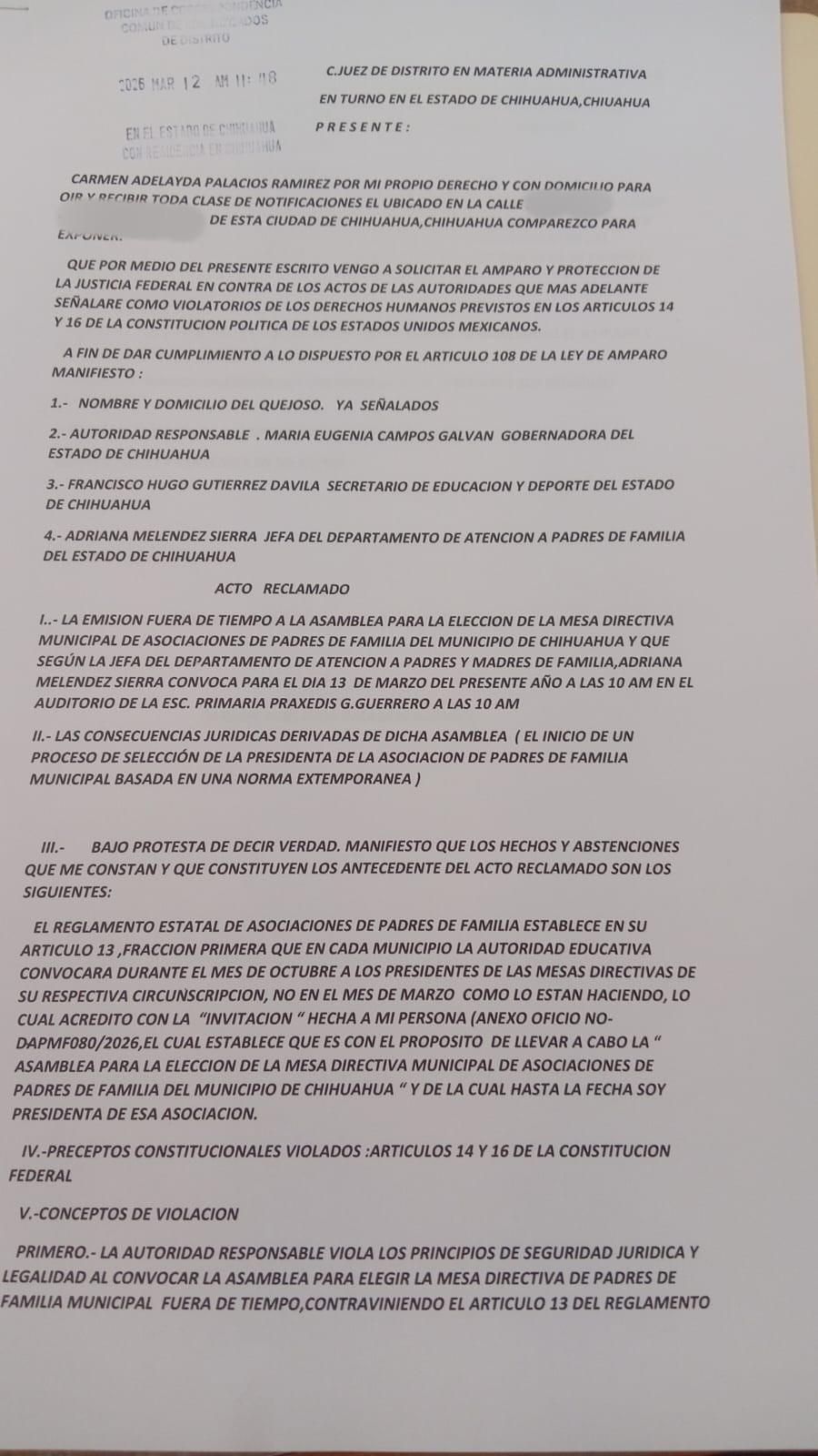 Sin embargo, la recepción de la convocatoria detonó una reacción legal por parte de Palacios Ramírez, quien este jueves interpuso un juicio de amparo ante un juez federal en materia administrativa en Chihuahua, argumentando que la convocatoria fue emitida fuera del plazo establecido por el reglamento.