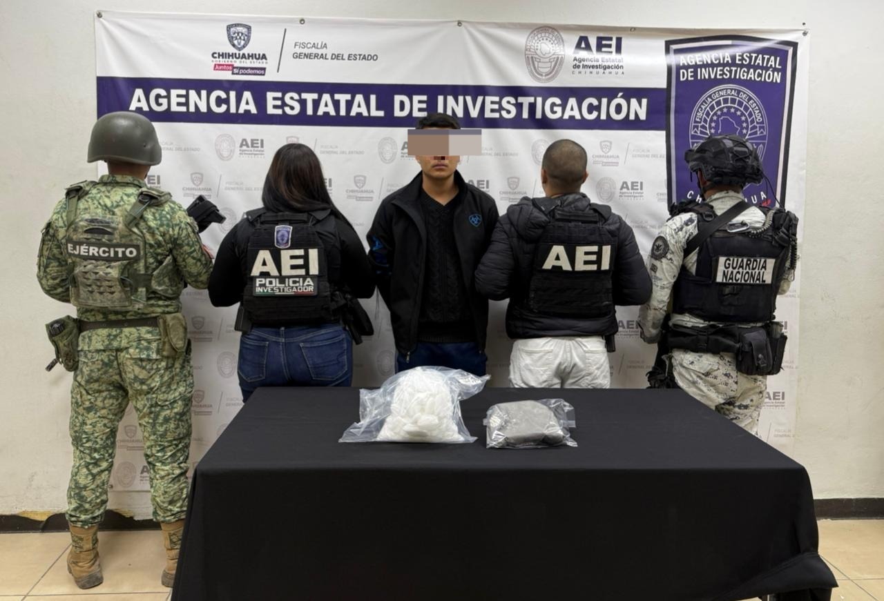 Elementos de la Agencia Estatal de Investigación, adscritos al Centro de Operaciones Estratégicas (COE), de la Fiscalía de Distrito Zona Norte, detuvieron a Kevin Federico A. M., por delitos contra la salud, en la colonia Cerradas del Parque, en Ciudad Juárez.