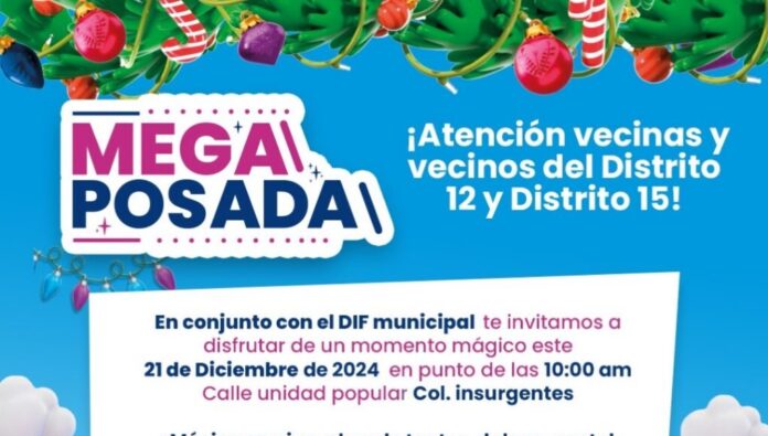 Chihuahua, Chih.— Las diputadas del Partido Acción Nacional (PAN), Joss Vega y Nancy “La China” Frías, en colaboración con el DIF Municipal, invitan a todas las familias de los distritos 12 y 15 a disfrutar de un momento mágico en la Mega Posada, que se llevará a cabo el próximo 21 de diciembre de 2024, a partir de las 10:00 a.m., en la calle Unidad Popular de la colonia Insurgentes.