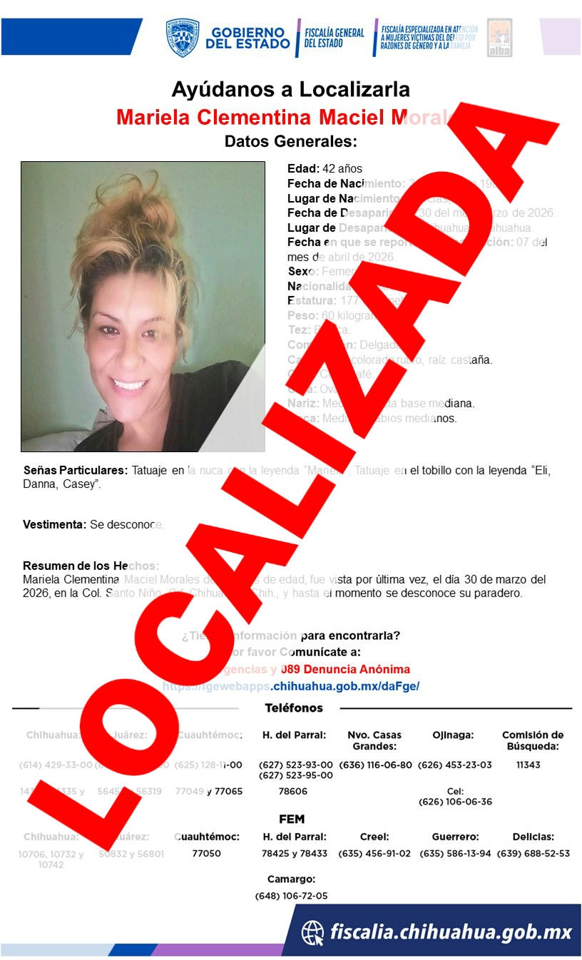 La mujer localizada, tiene 42 años de edad, fue reportada el 07 de abril y localizada el pasado lunes 20 de abril en Ciudad Juárez.