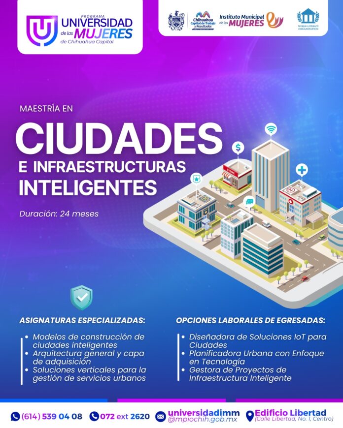 H. Ciudad de Chihuahua, Chih., a 28 de abril del 2026.- El Gobierno Municipal de Chihuahua, a través del Instituto Municipal de las Mujeres (IMM), invita a las mujeres interesadas en el desarrollo urbano y la innovación tecnológica a cursar la Maestría en Ciudades e Infraestructuras Inteligentes en la Universidad de las Mujeres.