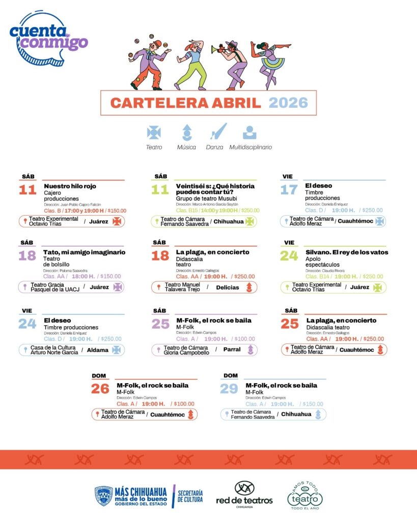 La programación de este mes contempla espectáculos de teatro, música, danza y arte multidisciplinario, y comienza el sábado 11 de abril en Ciudad Juárez, con dos funciones de la puesta en escena “Nuestro Hilo Rojo”, a las 17:00 y 19:00 horas, en el Teatro Experimental “Octavio Trías”, con un costo de 150 pesos.