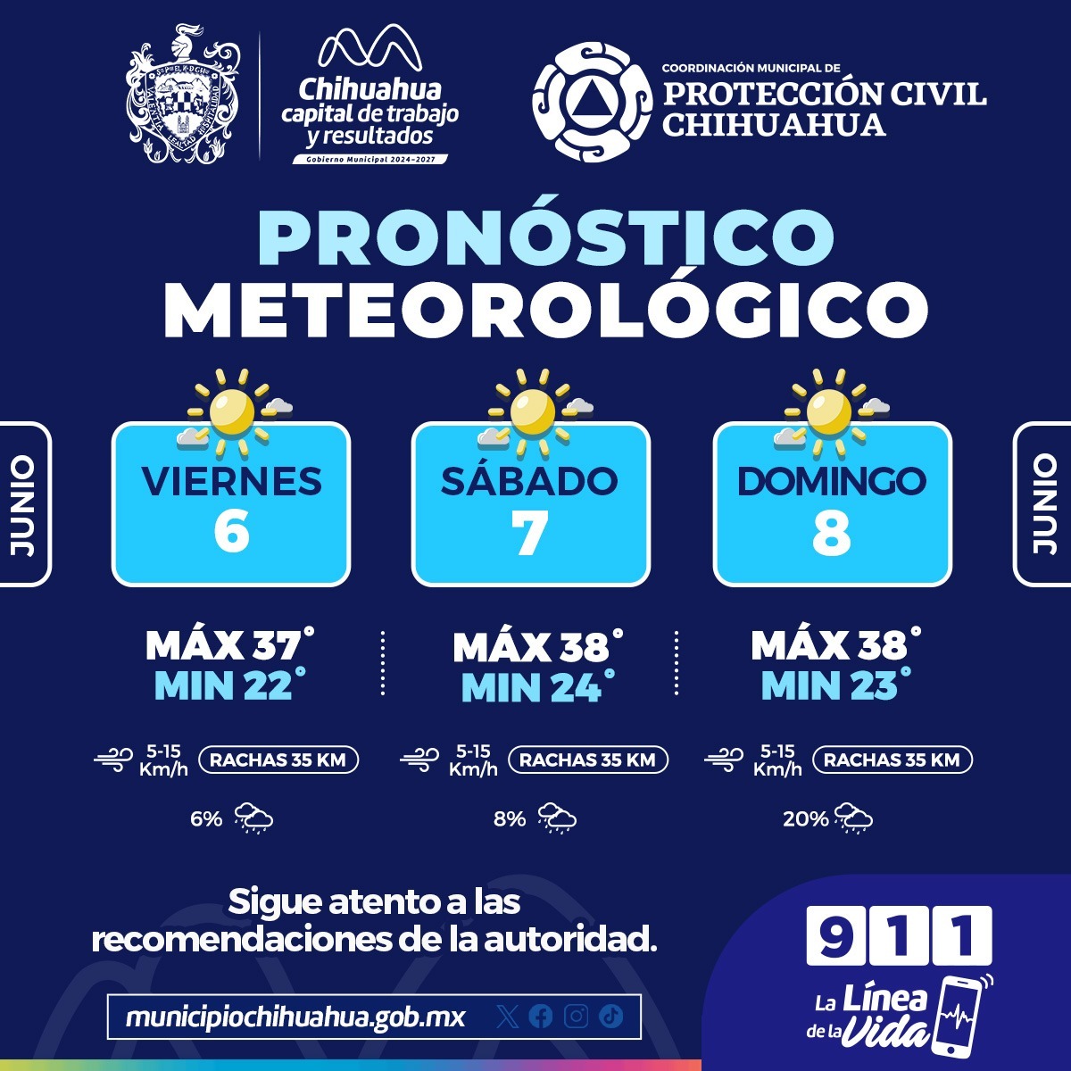 H. Ciudad de Chihuahua, Chih..- La Coordinación Municipal de Protección Civil de Chihuahua informa que, para este fin de semana del 6 al 8 de junio, se prevé un ambiente fresco por las mañanas y noches, así como un ascenso gradual en las temperaturas por la tarde, alcanzando máximas cercanas a los 38°C.