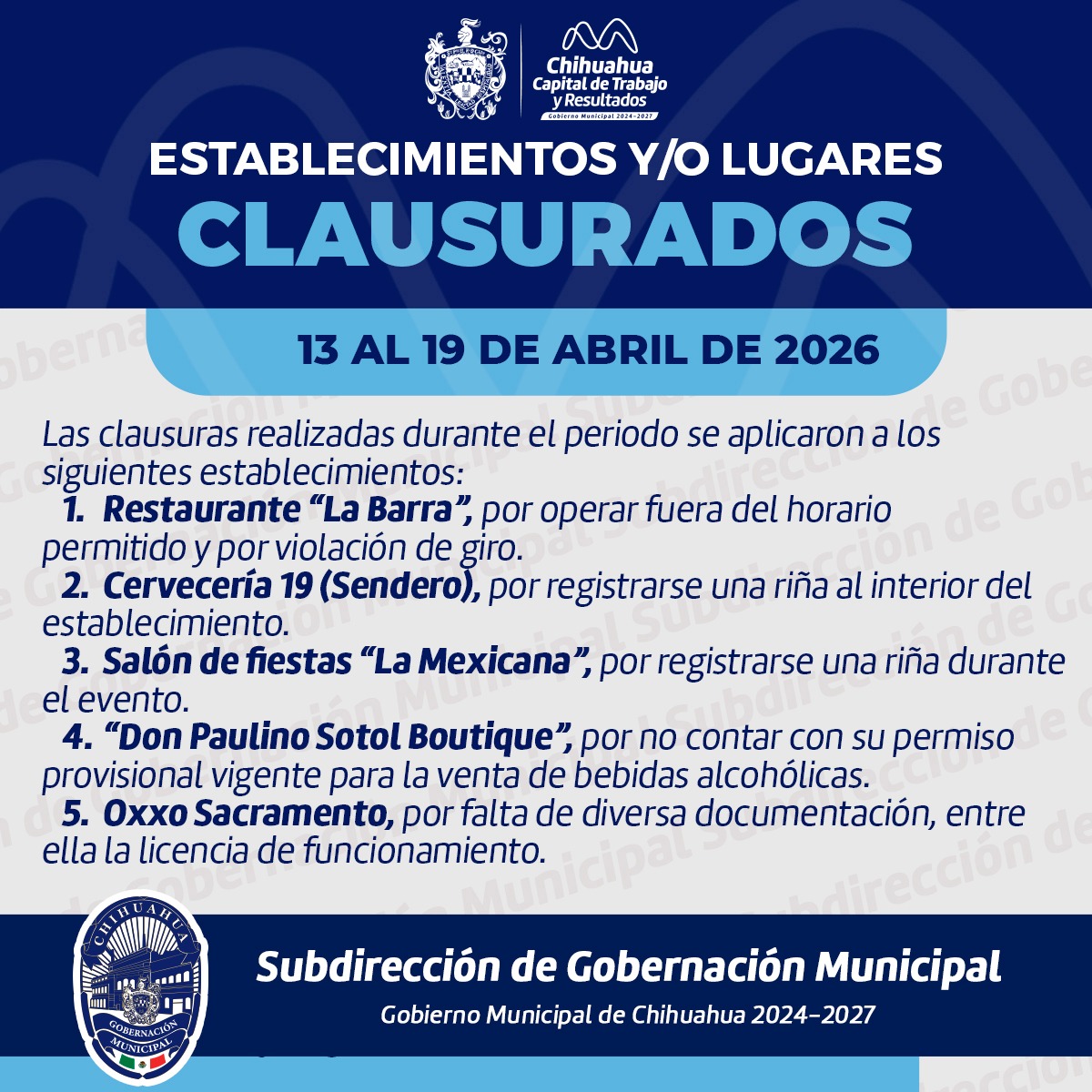 H. Ciudad de Chihuahua, Chih., a 20 de abril de 2026.- La Subdirección de Gobernación del Gobierno Municipal de Chihuahua, informa los resultados de los operativos de supervisión realizados del 13 al 19 de abril, con el objetivo de garantizar el cumplimiento de la normatividad en establecimientos comerciales y espacios de convivencia.