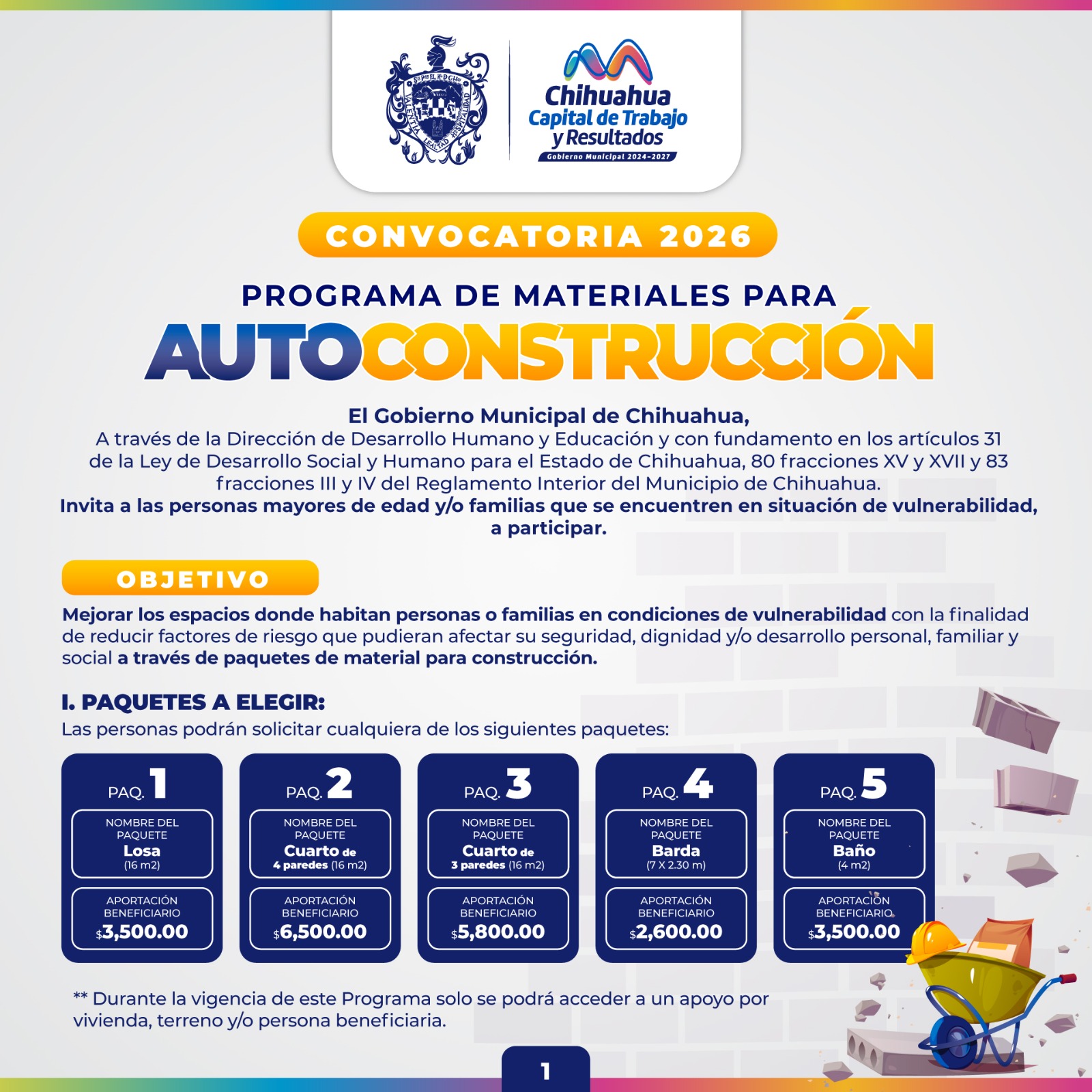 H. Ciudad de Chihuahua, Chih., a 13 de abril de 2026.– El Gobierno Municipal de Chihuahua, a través de la Dirección de Desarrollo Humano y Educación, invita a la ciudadanía a participar en la convocatoria del Programa Materiales para Autoconstrucción 2026, dirigido a personas mayores de edad y familias en situación de vulnerabilidad.